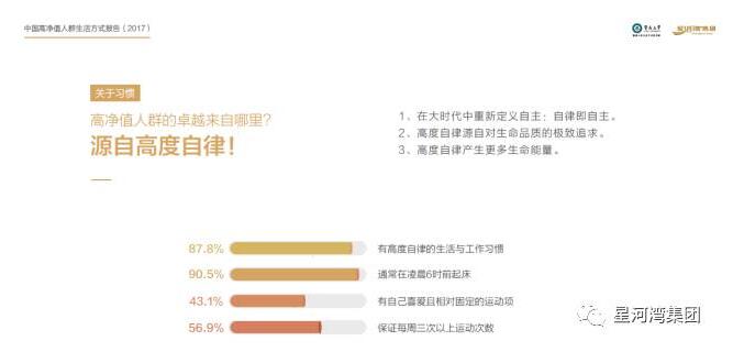 他們高度自律。43.1%的高凈值人群通常在凌晨6點前已經起床。超過90%的高凈值人群都有自己喜愛且相對固定的運動項目,其中近六成人士每周運動3次以上。
