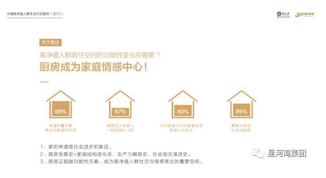 正因如此,他們的居住需求開始從物理空間向情感空間嬗變。《報告》揭示了一個有趣的細節廚房取代客廳,成為高凈值人群的家庭情感中心,89%的家庭青睞開放式大空間廚房。