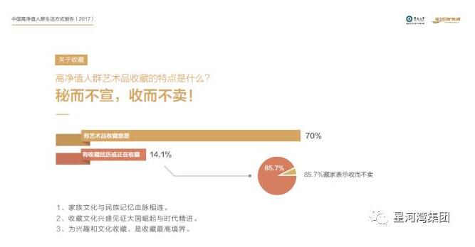 他們不是土豪,比起炫耀性消費,他們更注重品質化的個性消費?!秷蟾妗凤@示:89.7%高凈值人群中青睞私人定制。他們也喜好收藏。57.4%有藝術品收藏意愿。比起珠寶玉石,他們更青睞字畫。在高凈值人群看來,收藏是為了滿足興趣文化愛好,85.7%表示收而不賣。