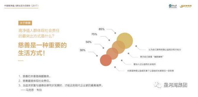 更為重要的是,他們普遍具備社會責任感,將慈善視為重要的生活方式之一。75%的高凈值人群曾經捐款捐物,一半以上加入過公益性社會組織,30%長期堅持做公益,或在某個公益組織長期任職。